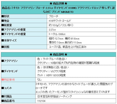 Product name: MIKIMOTO Aquamarine Brooch 2.27ct Diamond K18WG Aquamarine Drop Droplet Tear Brand MIKIMOTO