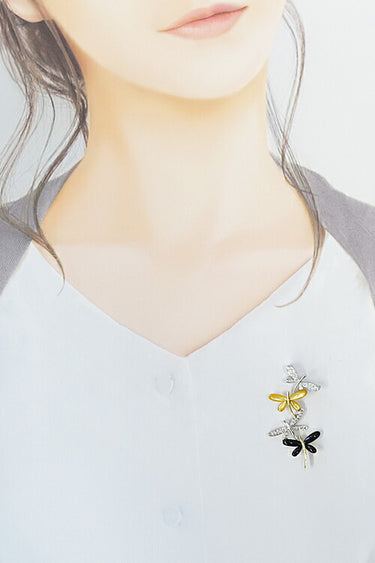 This elegant pendant brooch features a design of four dragonflies flapping their wings in a gentle curve.