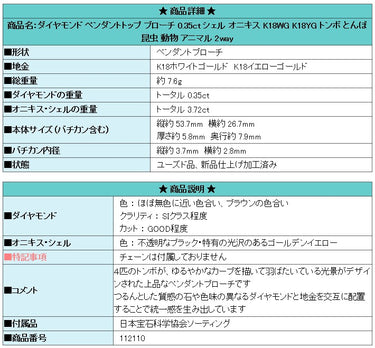 Product name: Diamond pendant brooch 0.35ct shell onyx K18WG K18YG dragonfly insect animal 2way