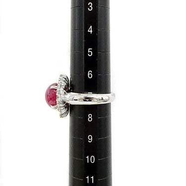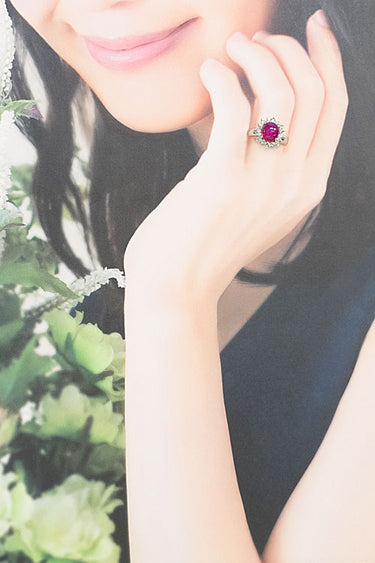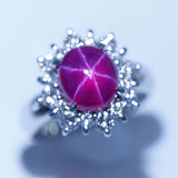 This ring from Cresent Vert features recrystallized star ruby ​​and diamonds set like a flower, giving it a distinct star effect.