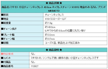 Product name: MIKIMOTO Azuki Chain Necklace 43.0cm Necklace Chain K18YG Base metal only No stones Brand MIKIMOTO