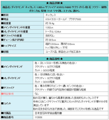 Product name: Diamond necklace 1.002ct sapphire K18YG Pt900 Sakura Sakura Cherry blossom Flower Plant Botanical Pear-textured Matte Enamel Openwork