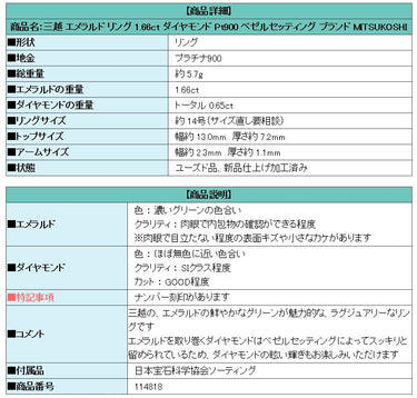 Product name: Mitsukoshi emerald ring 1.66ct diamond Pt900 bezel setting Brand: MITSUKOSHI