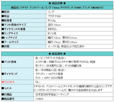 Product name: MIKIMOTO Akoya pearl ring 7.6mm diamond Pt900 Brand MIKIMOTO