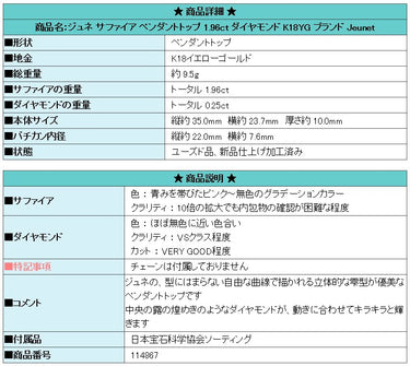 Jeunet Sapphire Pendant 1.96ct Diamond K18YG Brand Jeunet | 18K Pink Sapphire Diamond Gorgeous Elegant Stylish Cute [Used] [SH114867]