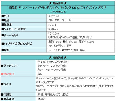 Product name: Tiffany T Diamond Smile Necklace K18YG Smile Line Brand: TIFFANY&Co.