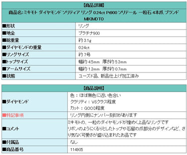 Product name: MIKIMOTO Diamond Solitaire Ring 0.24ct Pt900 Solitaire Single Stone 4 Prongs Brand MIKIMOTO