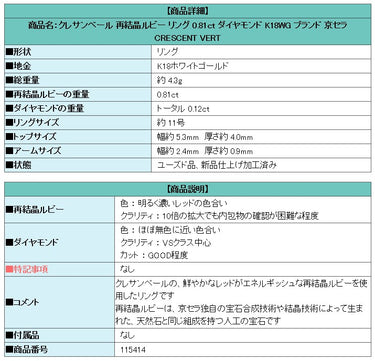Product name: CRESCENT VERT Recrystallized Ruby Ring 0.81ct Diamond K18WG Brand Kyocera CRESCENT VERT