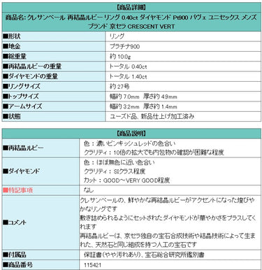 Product name: CRESCENTVERT Recrystallized Ruby Ring 0.40ct Diamond Pt900 Pavé Unisex Men's Brand Kyocera CRESCENTVERT
