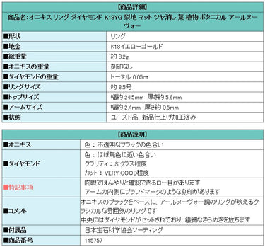 Product name: Onyx ring, diamond, K18YG, matte finish, leaves, plants, botanical, Art Nouveau
