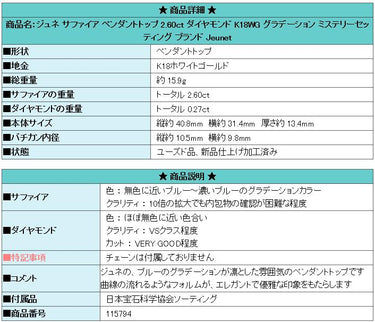 Product name: Jeunet Sapphire Pendant Top 2.60ct Diamond K18WG Gradient Mystery Setting Brand: Jeunet