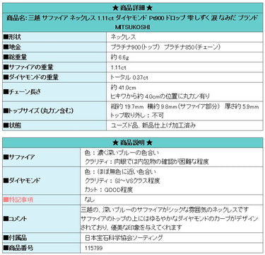 Product name: Mitsukoshi Sapphire Necklace 1.11ct Diamond Pt900 Drop Droplet Tear Brand MITSUKOSHI