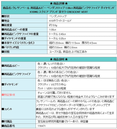 Product name: CRESCENT VERT Recrystallized Ruby Pendant Top 1.08ct Recrystallized Pink Sapphire Diamond K18WG Square Brand Kyocera CRESCENT VERT
