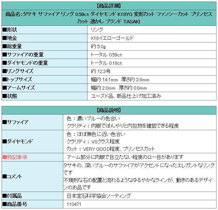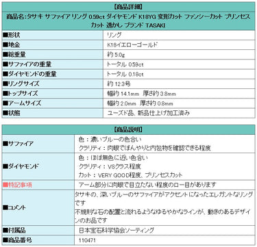Product name: TASAKI Sapphire Ring 0.59ct Diamond K18YG Deformed Cut Fancy Cut Princess Cut Openwork Brand TASAKI