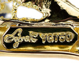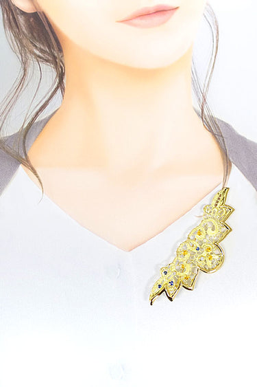 Genet's elegant brooch features a contrast between yellow and blue sapphires.