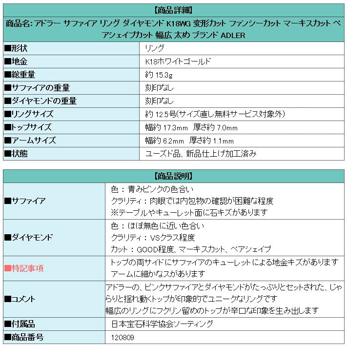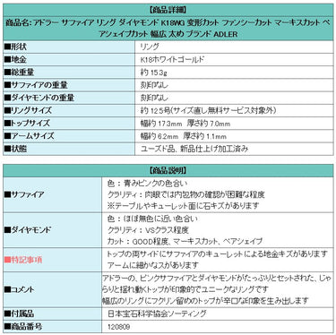Adler Sapphire Diamond K18WG Deformed Cut Fancy Cut Marquise Cut Pear Shape Cut Wide Thick Brand ADLER | 18K Pink Sapphire Luxurious Gorgeous [SH120809]