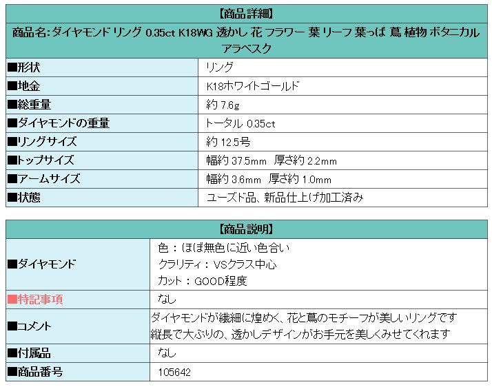 Product name: Diamond ring 0.35ct K18WG openwork flower leaf ivy plant botanical arabesque