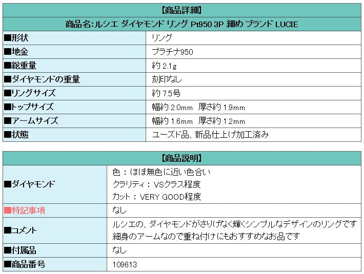 Lucie Diamond Ring Pt950 3P Thin Brand LUCIE | Diamond Platinum Daily Use Simple Cute Stylish [Used] [SH109613]