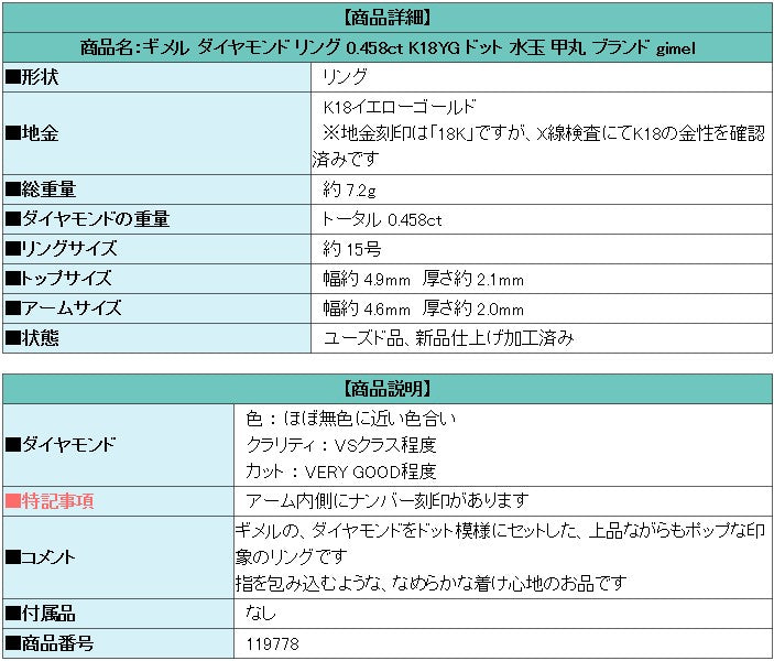 Product name: Gimel Diamond Ring 0.458ct K18YG Dot Polka Dot Round Brand Gimel