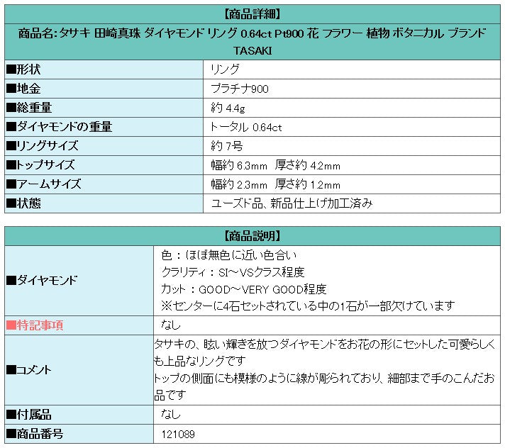 TASAKI Diamond Ring 0.64ct Pt900 Flower Plant Botanical Brand TASAKI | Diamond Elegant Cute Stylish [Used] [SH121089]