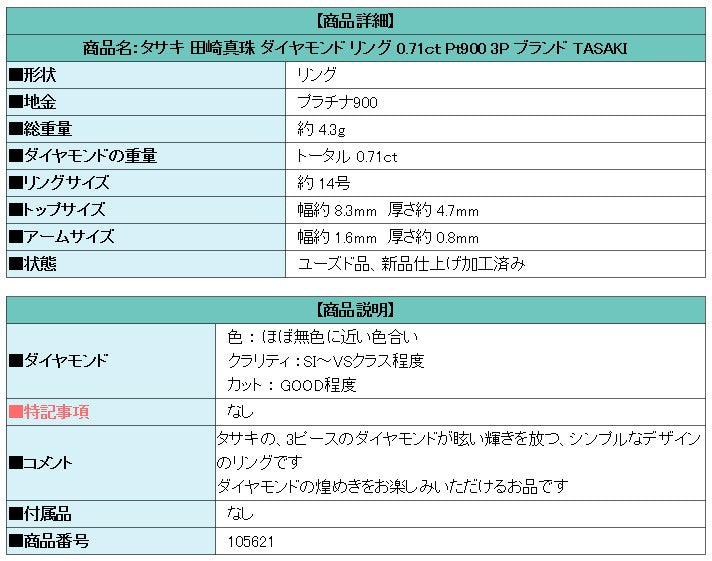商品名:タサキ 田崎真珠 ダイヤモンド リング 0.71ct Pt900 3P ブランド TASAKI