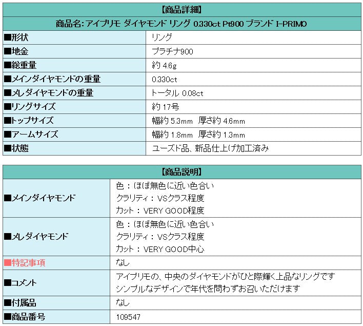 商品名:アイプリモ ダイヤモンド リング 0.330ct Pt900 ブランド I-PRIMO