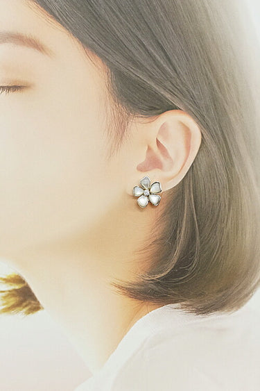 きらめくダイヤモンドを中央に、柔らかにつやめくシェルを花びら部分にセットした、フラワーモチーフのイヤリングです