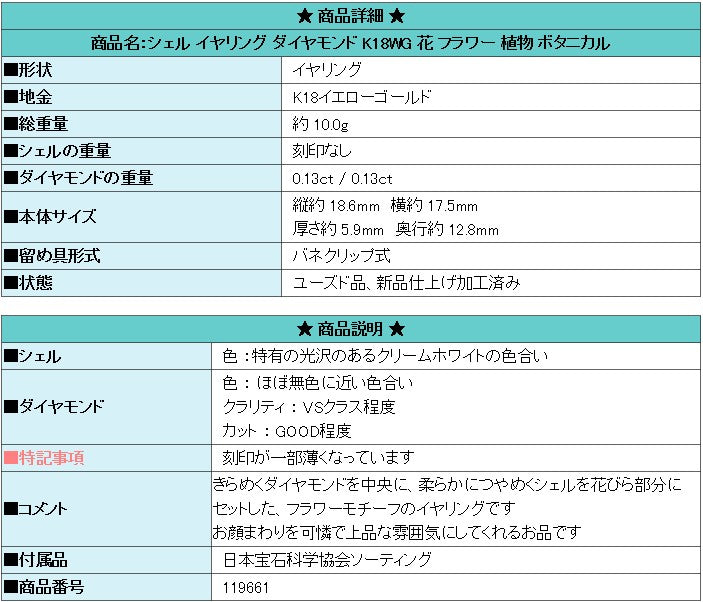 シェル イヤリング ダイヤモンド K18WG 花 フラワー 植物 ボタニカル | 18金 ダイアモンド 貝 デイリーユース かわいい おしゃれ【中古】【SH119661】