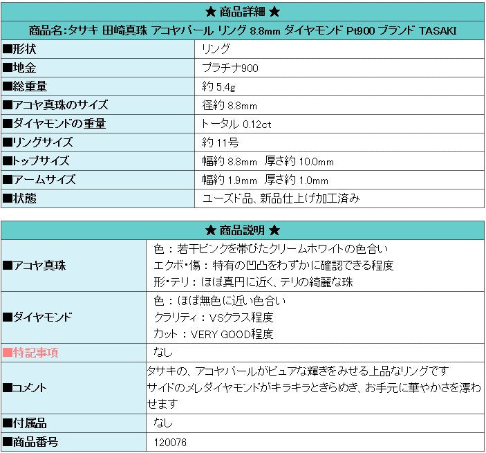 商品名:タサキ 田崎真珠 アコヤパール リング 8.8mm ダイヤモンド Pt900 ブランド TASAKI