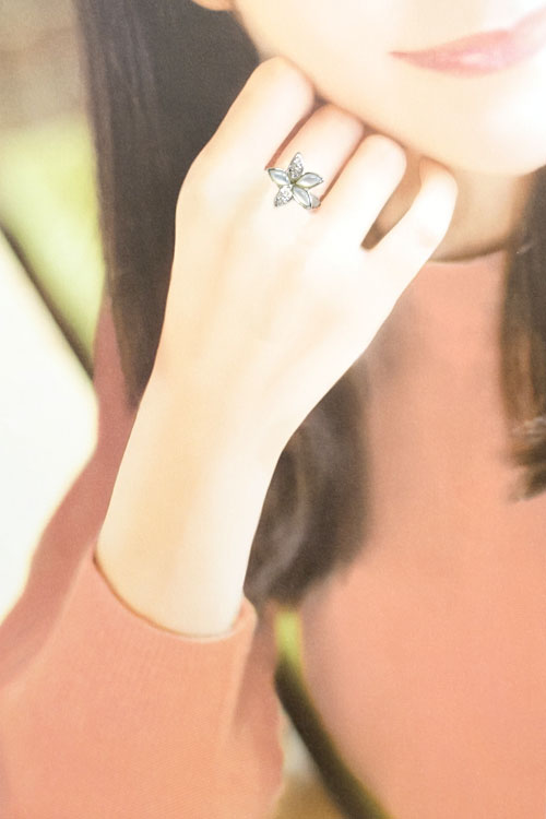 コメント タサキの、ダイヤモンドとシェルがセットされた大きなフラワーモチーフが印象的なリングです。シェルの瑞々しい輝きが清楚な雰囲気を醸し出します。